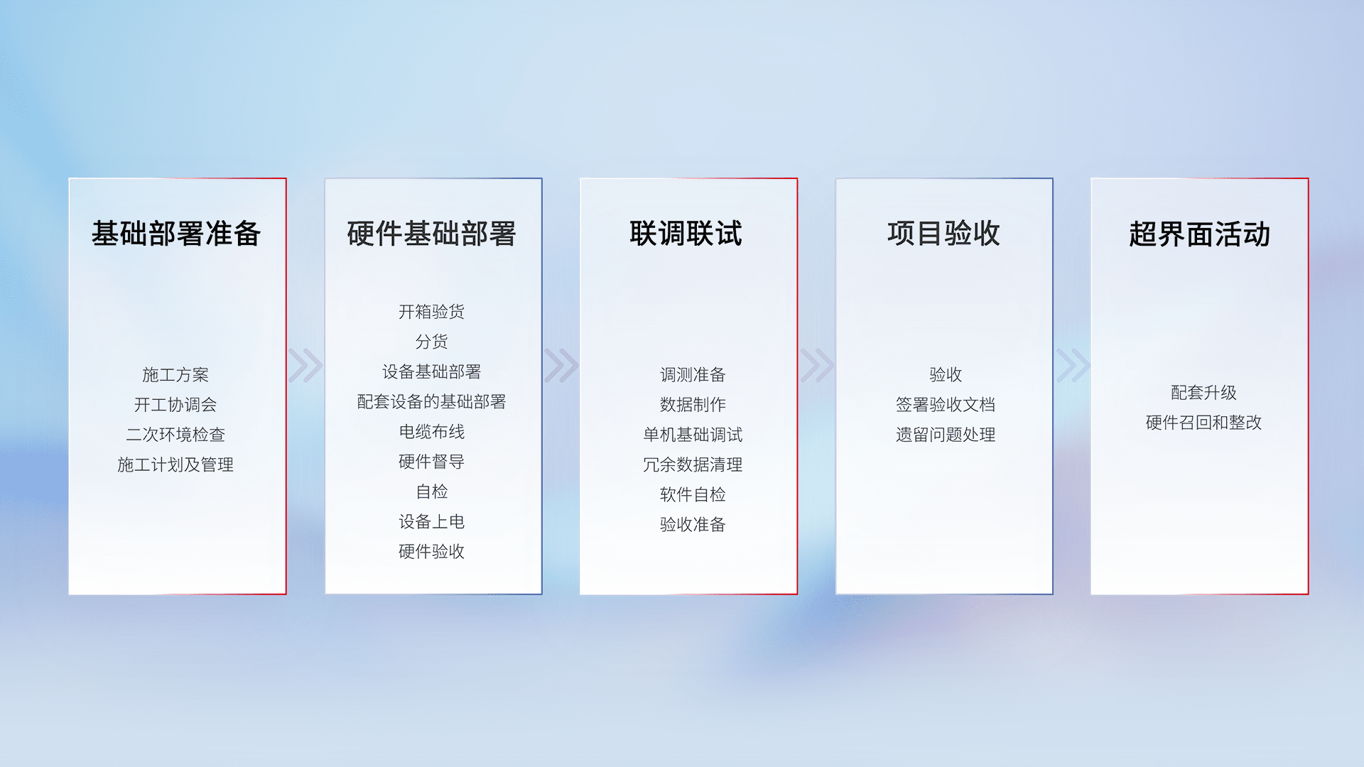 从基础部署准备、、、、硬件基础部署、、、、联调联试、、项目验收、、、、越界面活动的全过程可追溯,,保证施工质量和进度。。。。