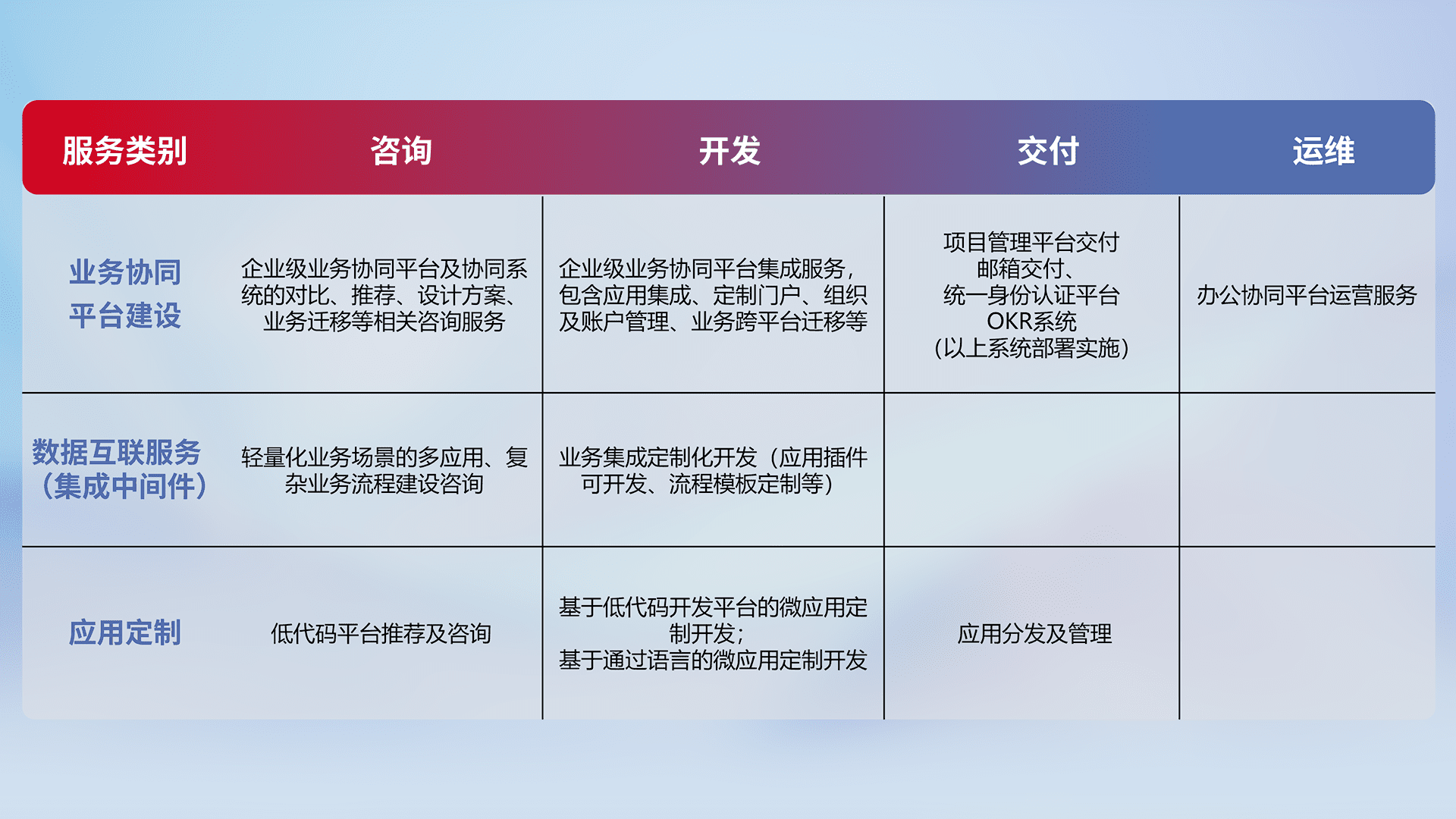 针对钉钉、、、、企微、、、IDaas等平台级产品提供产品的规划、、、、方案、、交付、、、定制化开发等服务,,,实现如统一协同办公、、、、智能客户服务、、、、混合会议管理、、、智能数据查询、、、、等业务场景,,,实现数字化转型。。。。